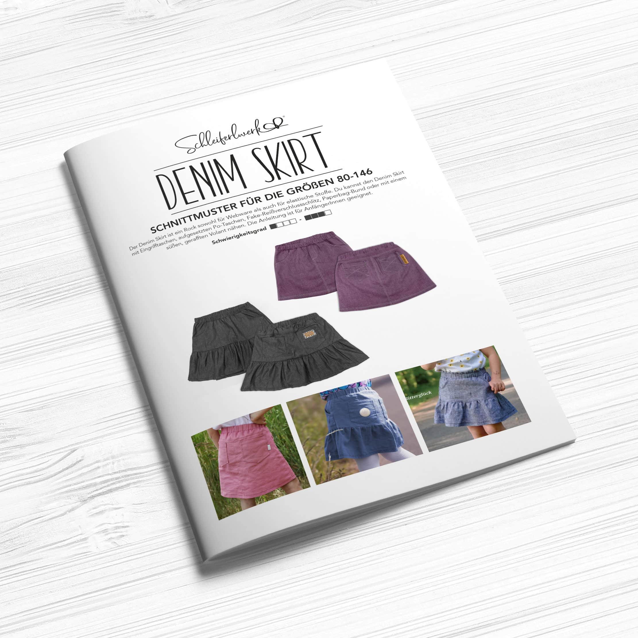 Der Denim Skirt ist ein Rock sowohl für Webware als auch für elastische Stoffe. Du kannst den Denim Skirt mit Eingrifftaschen, aufgesetzten Po-Taschen, Fake-Reißverschlussschlitz, Paperbag-Bund oder mit einem süßen, gerafften Volant nähen. Die Anleitung ist für AnfängerInnen geeignet.